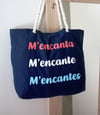Bossa de platja de color blau obscur amb el lema de Lameuapau "Quan somrius li fas l'amor a la vida" en tres colors amb corda.